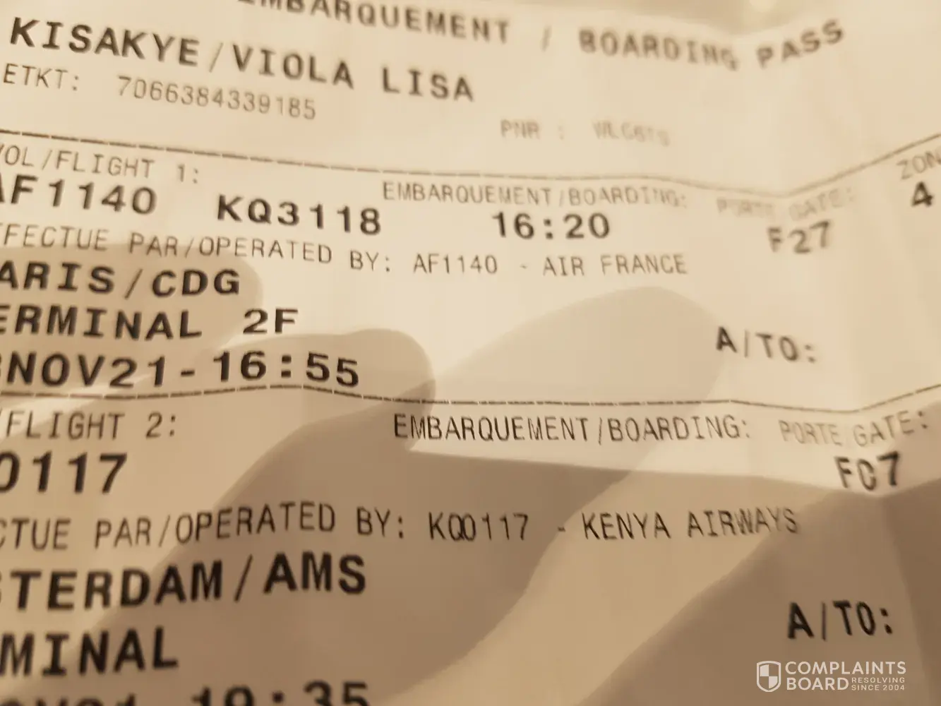 Kenya Airways flight No. KQ 101, Booking Reference R2YY70
