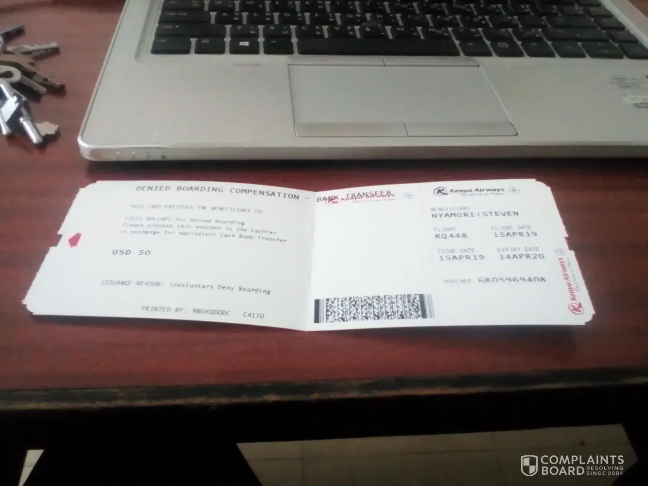 Flight overbooking, cancellation of flight and lack of compensation. I was to travel to Bujumbura last week on Monday 15th April 2019 with with the 0720hrs flight from Nairobi to Bujumbura via Kigali. Unfortunately the flight was overbooked and an alternative of leaving at 1300hrs to Kigali with KQ and Ethiopian Airways to Bujumbura was given. While we were waiting to board, a cancellation was announced. This broke me down since I had waited from 5am at the airport. Since I had to travel, I made arrangements with Rwanda Air and I finally went to Bujumbura with Rwanda Air the same day. A USD 50 could compensation was said to be paid upon filling the forms with our account numbers. This has not been done. Above all, KQ did nothing to compensate the cancellation.