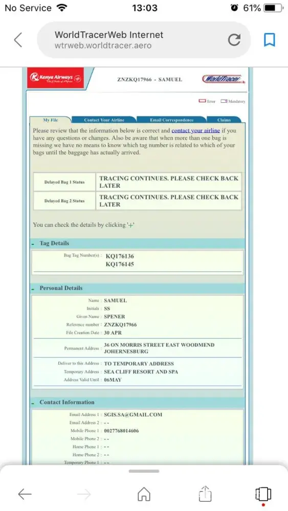 Kenya Airways staff in Johannesburg checked both bags in under the name of S Samuel - who knows why (see bag tag attached).