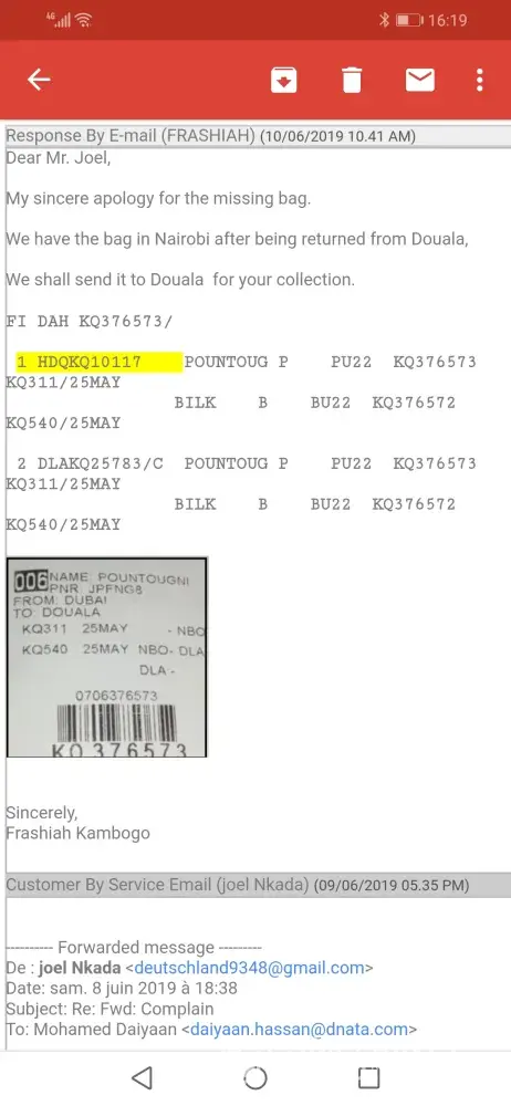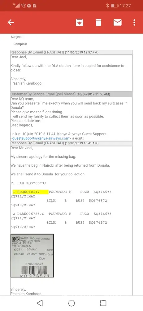 I started sending the Email to dubai airport, kenya airways head office in dubai and even Kenya airways in Nairobi and definitly Nairobi replyed me that Douala airport have sent back my luggege in Nairobi. I have told them soo manytimes to send back my suitcases in Douala because my wife is waiting in the airport every day. they said the will send until now they just sent only one suitcases and another one is lost until vow. I keep sending my complain to them and Duabi office no one respond. I am sending them messages every single day but nothing they stop replying me. I am staying in Abu Dhabi and I am very busy with my job to go and complain to Dubai airport about my luggaes.