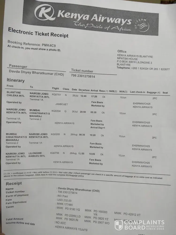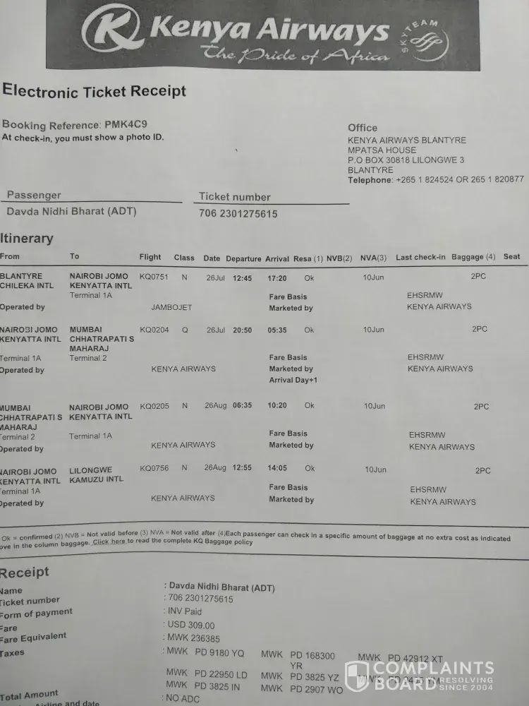 Kenya airlines must take responsibility and give us due compensation for the delay in flight, delay in baggage delivery (which we still haven't received) and for us missing our connecting flight. Due to the negligence and carelessness of Kenya Airlines, we had to spend so much money for boarding and lodging at Mumbai, high airfare, due to last minute booking, we had to buy a whole lot of items of daily needs including clothings etc.. At the time of making the report for missing baggage by Kenya Airlines staff, it was promised that the baggages will be home delivered within 48 hours, but till now I have not received the same.