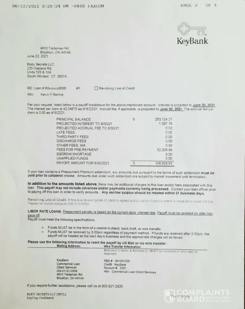 I am Veteran, 72-year-old woman and owner of Body Secrets, LLC, South Windsor, CT, for a little over 15 years. In May of 2006, I took an SBA Loan to finance two business condo units for my business which all aspects of the loan were explained to me fully. In 2018, I was approached by a Key Bank manager, to see how Key bank could help to insure the survival of the business. At that time, my SBA loan interest had gone up to almost 10%. It was then suggested that refinancing the SBA loan would be a good option for the health of the business. I was called from work to sign loan documents, which each page was quickly explained but there was no discussion about a pre penalty payment fee. This loan had a lower interest rate then the current loan but I would have never agreed to the refinance if I was clearly made aware of the potential amount a prepayment penalty would be. Given my age the bank had the reasonable expectation the loan would inevitably would be prepaid. On its face, they were helping me by offering a lower interest rate loan but the facts are clear they targeted me with a lower interest rate loan knowing that they would profit to my detriment by putting prepayment penalty language in a loan document that is impossible to interpret by the average consumer. They made no verbal representations of the existence of the penalty. If they did make such representations, I would not have agreed to the loan.