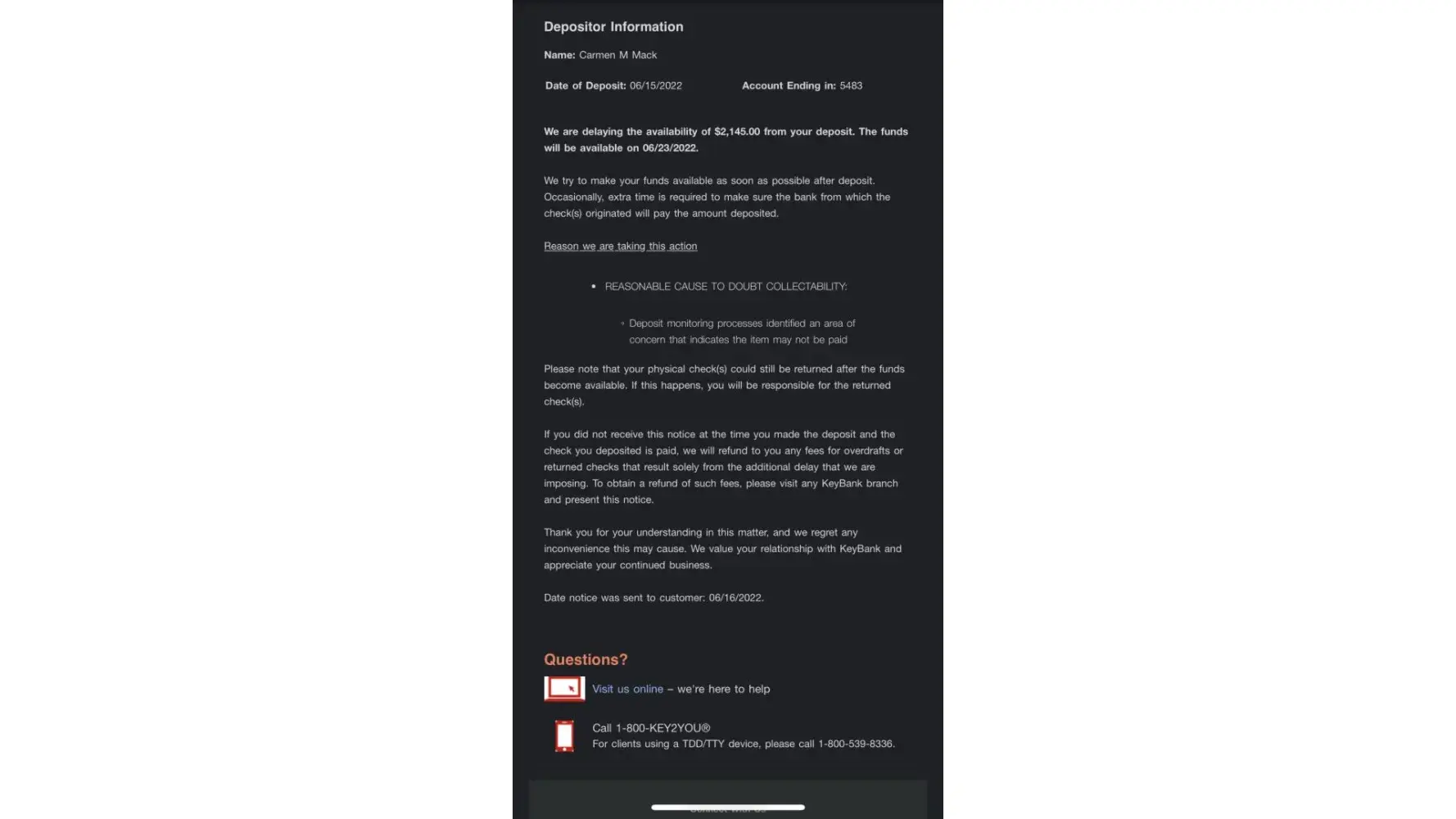 On june 15th I deposited a money order from freedom credit union given to me as a personal loan to cover my security deposit and 1st month rent through my mobile banking app which was accepted at the time, next business day I received and email from keybank stating that it was placed on hold and that my funds would be available on 6/23/22 (see attached email) I went the following day 6/17/22 to keybank on high st. In holyoke ma to see what was the reason that occurred and brought the actual money order still unsigned and explained what just had occurred they told me that usually if I did not have the funds in my account to cover the amount of the money order which was $2145. The the bank usually holds it for 5 business days, in the meantime I have been restricted from accessing my accounts and/or my debit card, keybank teller told me I just had to wait until the funds were available to call prior to coming in to have the restriction removed and receive my funds, I had also called the keybank customer service & fraud dept. And was told the same thing. I called early morning on 6/23/22 to see if my funds cleared and was told nothing was pending and gave me the current balance I had after keybank took the overdraft fees, I go in-person to kebank in holyoke ma again so I can have access to my account and funds teler had to call fraud dept. And spoke to someone from investigation dept. Who went on to say that I could not get access to my funds because it was still under investigation which I couldn't understand if the money order cleared the funds were made available why I couldn't have access to my money again I was brushed off with no explanation or timeframe as to how much longer it was going to take. I left and once again called the fraud dept. I told them if there was anything I could do to expedite the restriction as this was the first time I had ever had to go through something like this, I mentioned that I was willing to go with the person who issued the money order to me and bring proof that fcu released the funds to keybank and/or if they could stop the deposit so that I could go to the actual bank that issued the money order so that I could cash it with them or deposit it with fcu since I just opened an account with them and was told there was nothing that I could provide and they could not stop the deposit again with no explanation or timeframe no solution. I don't even know when I will have access to my funds since I am completely restricted from viewing my accounts which at this point I feel it's unfair and against my rights to my funds that are just sitting in my account but they were quick to deduct the amount owed to them. Please help resolve this matter. Thank you