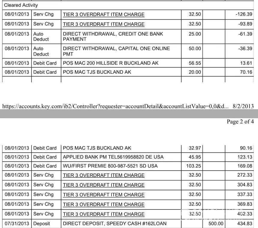 On July 31, 2013 Early in the AM my deposit of $500.00 was shown at my online banking. So at that point I had no charges. I shopped what I had in the bank during the day. And went to work. Then at late evening July 1 I started checking my account. That is when I noticed somebody switched my charges ahead of my deposit. The only proof I have is when Speedy Cash sent my money. And here is the resulting statement.