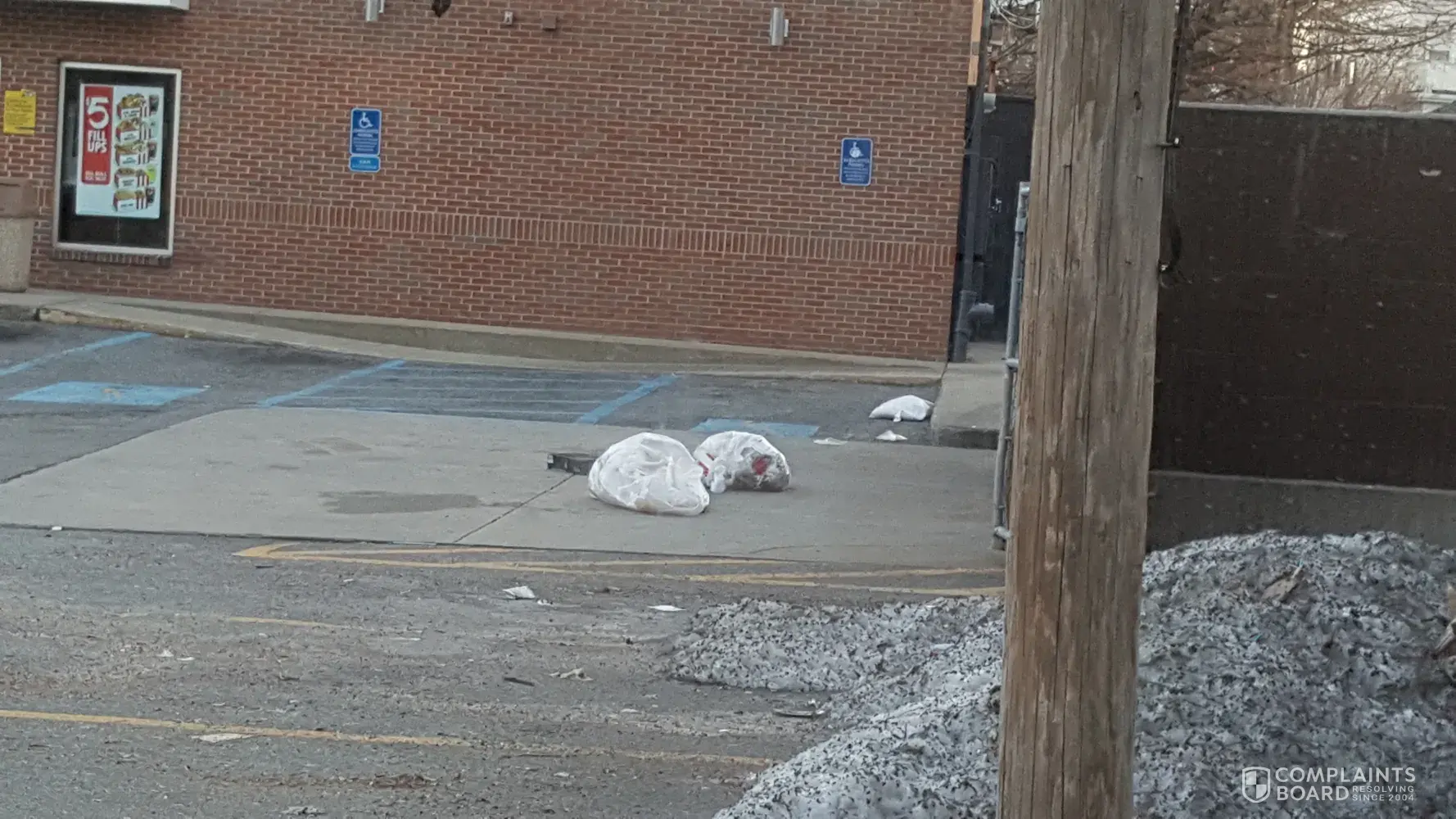 unkempt parking lot / dumpster / trash can / trash all over the property