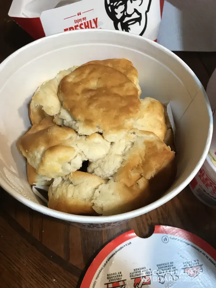 There is a chemical taste in the food. Could be from storing food in warmer in styrofoam containers or could be something wrong with the burners in the warmer unit itself. We bought a 16 pc bucket with 4 large sides and a popcorn chicken share bucket. The only sides that have no chemical taste are the biscuits and the coleslaw.