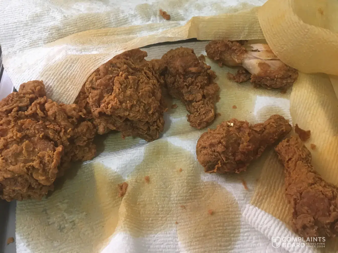 I picked up a 20$ fill up on Tuesday, Jan 15th, 2018 at 519 pm store num j7188318 5437 hwy 90 mobile, Alabama ticket number 1542 I went thru the drive thru and proceeded home. I didn't notice Tuesday evening but on Wednesday when we had left overs I noticed there was no breast in the box. We were given 4 thighs, 2legs, 2wings. It slipped my mind to call on Wednesday because school was out in m mobile county and I was dealing with my sick child as well. I remembered on Thursday to call not expecting a complete order replacement but to have at least the 2 breast replaced I spoke with the manager named Prince and asked me if I could return the order. I advised him I lived 30 minutes away and do to the circumstances that would be impossible. He advised me that do to new policy that I would need to bring the entire order to be replaced. It would have been no problem if I lived 5 minutes or ten minutes away.but the fact that I live 30 minutes away, the schools was already being closed the next day so to ice and freezing temps would have definitely been an issue as well... I normally pick up dinner here at least once a week and order the same thing. Previously I've had no issues when I have called and spoken to the manager about my order. The last time I had issues the Cole slaw containers (4)I ordered was half filled. I spoke with a gentleman and had no issues replacing them. Thetime before I had issues with biscuits being to hard.no issues replacing biscuits...I do apologize for the late complaint but this is an issue that needs to be addressed. You cancontact me via email or on my cell. My email address is Vrknight121612.[protected]@g mail.com my cell number is [protected].