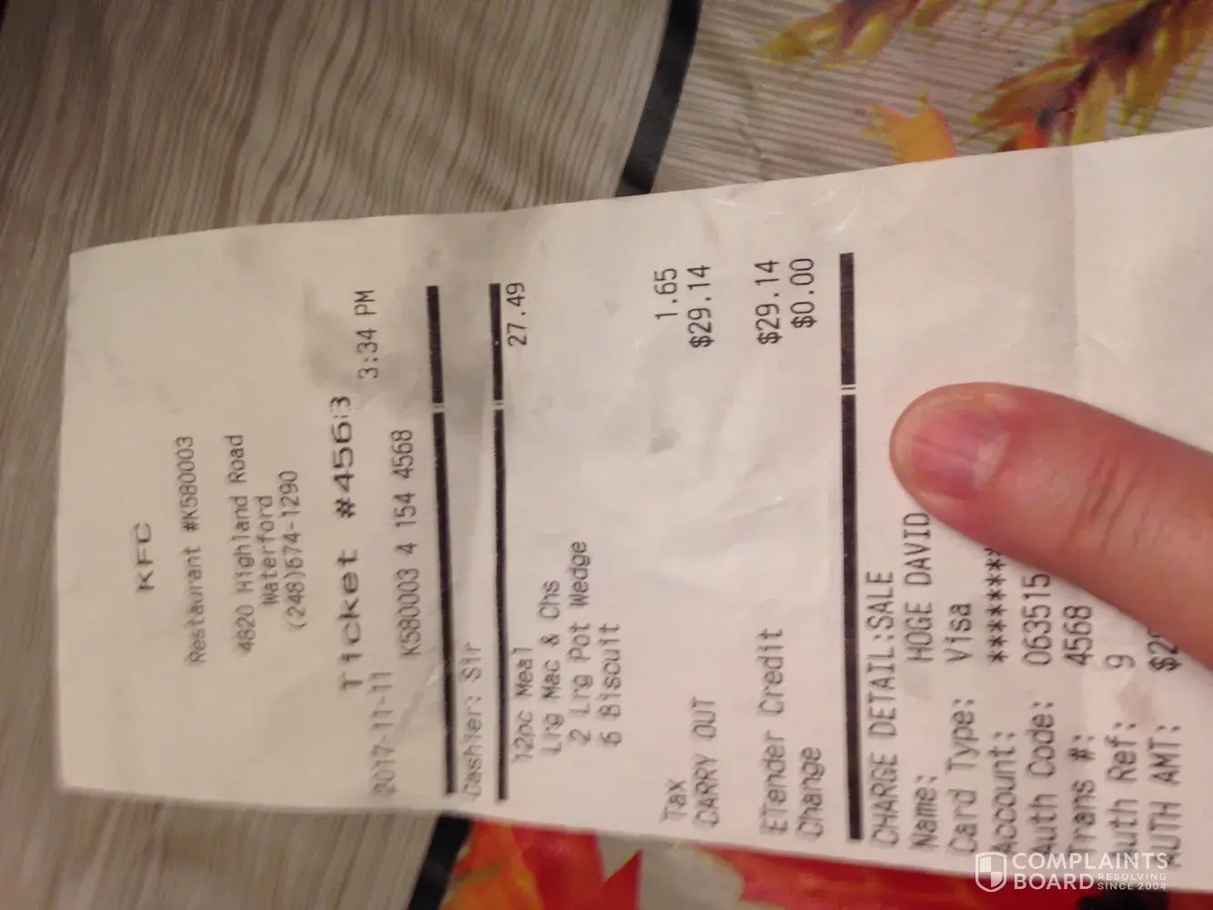 We were in Amherst NS at the kfc on November 13th. When i ordered chicken I explained to the lady that the last time we were there, the pieces were so small and unrecognizable, that the breast was smaller than the wing. She said the chicken was better now. So I continued and ordered a bucket. Got home to the same old chicken. So small, pieces unrecognizable, soaked and dripping in oil. Garbage. Paid 35$ for garbage. Looks like pigeon meat the pieces are so small. Big turn off. I will not be back again. What happened to the old kfc chicken? I took pictures of what your store is serving. It's disgusting. Shame kfc.