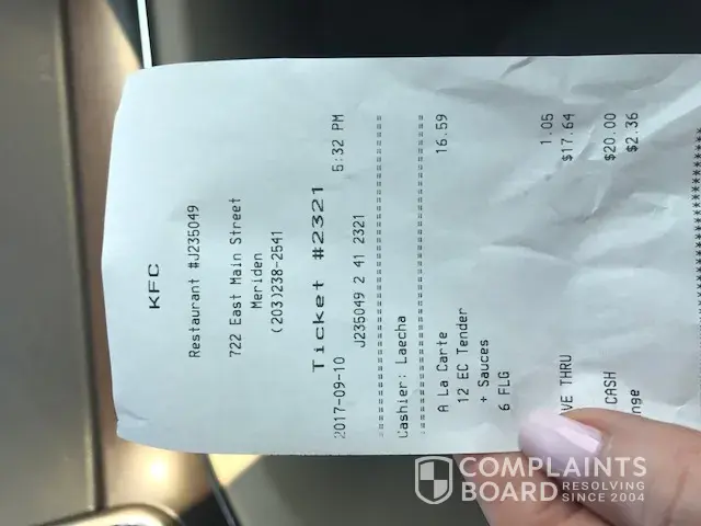 I posted my dissatisfaction on Facebook and multiple people respond, it happens to them at different locations. My mother was a manager for KFC for many years and knew Pete Harmon personally, Im sure that if Pete was alive today this store would be making changes or be closed permanently. The cashier was CALIEM and was very pleasant to us. My total bill was $59.72 not worth it if you ask me!