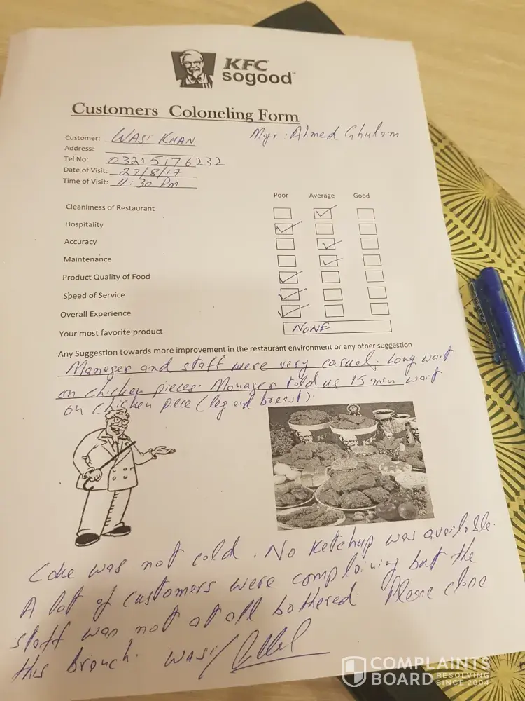 In pakistan islamabad f 10 branch the food served is cold and avg wait time is 20 mins. When we complain the staff gives justification of shortage of food. Most of customers were complaining abt long wait time and cold food. They said that they dont have ketchup when i asked for it. The coke 1 litre bottle was hot and they served ice in the paper boat. No complaint register and i was not given complaint number for my written complaint. Most of kfc branches in islamabad has same problem and we prefer now to have mcdonalds as they serve chicken pieces now.