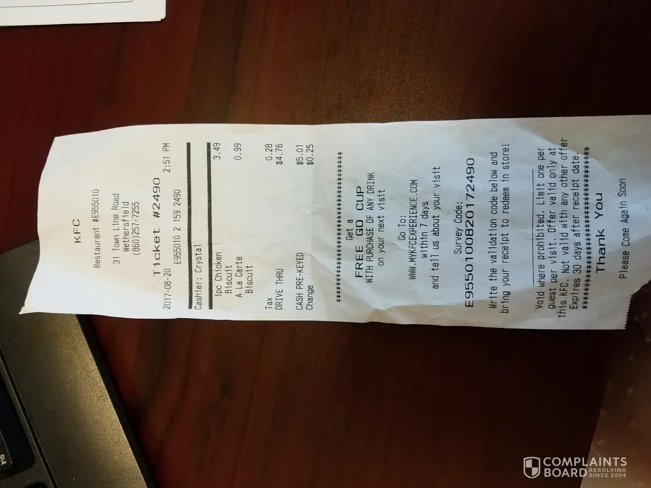 I ordered one piece of chicken and 2 biscuits on 8/20/17. My order came to $4.76. I gave the drive thru server $20.01. I even announced "twenty oh one" as I handed the money to Crystal. Crystal entered $5.01 into the register. Needless to say they had to count the drawer and said I was mistaken. II reversed my steps for the day and know for a fact that I had only 2 twenties in my wallet when I went thru the drive thru. The assistant manager stated when they closed the store they will call me after they cash out all the drawers. They called me at 10:41pm to let me know they were not over. Someone is trying to pull a fast one at this location and owes me $15.25. My receipt number is 2490 and the location is E955010, 31 Town Line Road, Wethersfield, CT. I can be reached at [protected]. Thank you