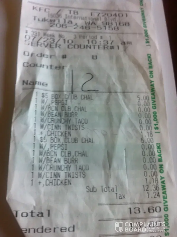 Actually I just received a postcard in the mail from KFC apologizing and telling me I can pick up a replacement 16 pc-bucket of chicken. I believe that this complaint blog is the reason my issue was resolved. And yes Td I will go back to pick up my food. They resolved the matter so therefore I hold no resentment. I just expect that companies and corporations resolve valid concerns with their customers. And then there would be no reason for complaint blogs.