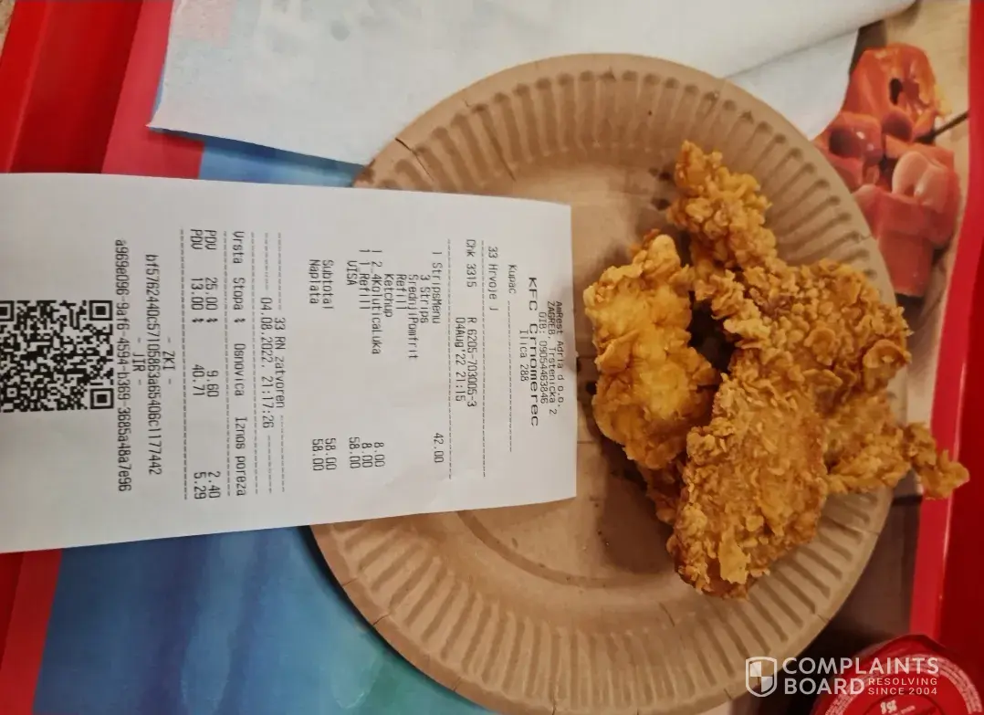 Terrible service, when I ordered menu I got different one, 3 tiny stripes and small potatoes portion, when I complained they told me that menu doesn't exist anymore, then why the hell would you confirm it and give me different one... Tiny, not even kid portion, they even charged me double for refill that is apparently included in the menu I didn't order, what the hell. I can't even complain on croatian sites because they don't work so no one can complain, and croatian app is configured like it was made by a kindergarten, it ruined my whole night