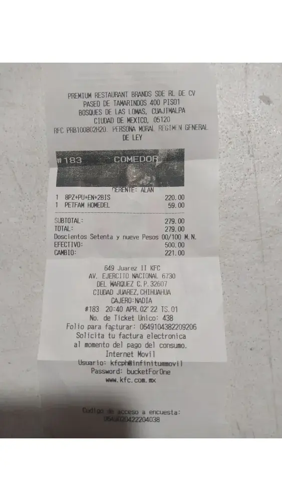 in that branch they already want to leave and they practically tell you take what I give you, as I give it to you or better go, how unfortunate it is to see that the only thing they are looking for are sales numbers with fewer ingredients as possible, preferring that the customers leave upset and like many people do not take the time like me to raise a complaint, you do not even take into account and nothing else improves the branches in aesthetics or architecture but not in the staff. It should be clarified that the girls who attended us were very nervous and not so much because of my complaint but because of what Alan Pérez could say or scold them, I ask you please that there be no retaliation against your workers, the cashier and other members who monitor that he is not going to treat them badly because of this circumstance or that they be fired. Monitor this case, improve your management staff, and above all, supervise the performance of your branches at times close to closing, that is when they give the worst attention to the public, verify that your area of ​​little games is open at the time it says that the branch is open, I am writing to KFC USA because it is something recurrent in several of its franchises in Mexico over many years and perhaps you are not even aware of it... If you need to contact me, I am Eng. Enrique Sansores and my CEL is +(52) [protected] and My e-mail si [protected]@hotmail.com thanks.
