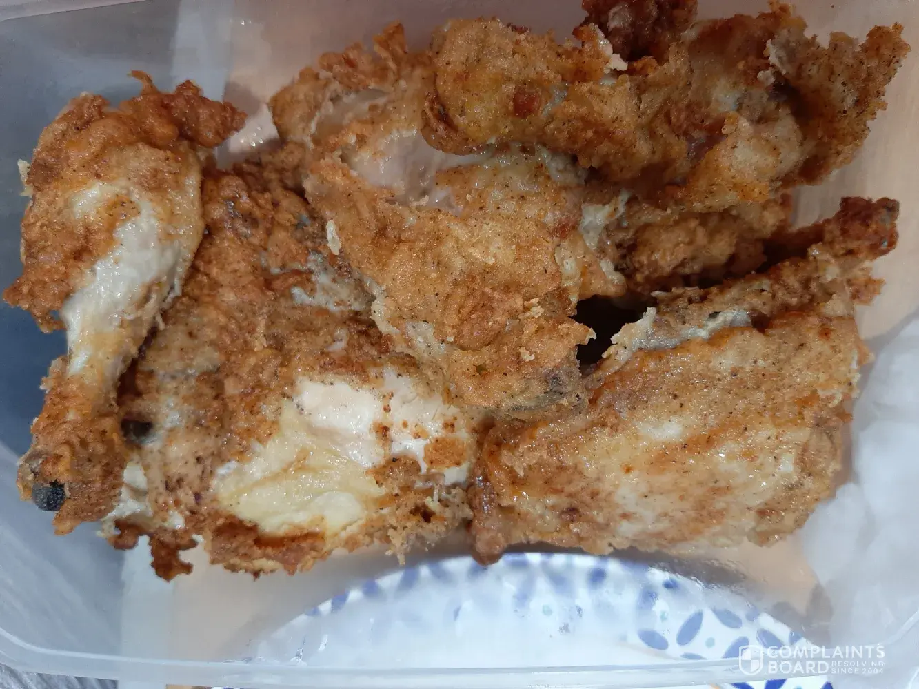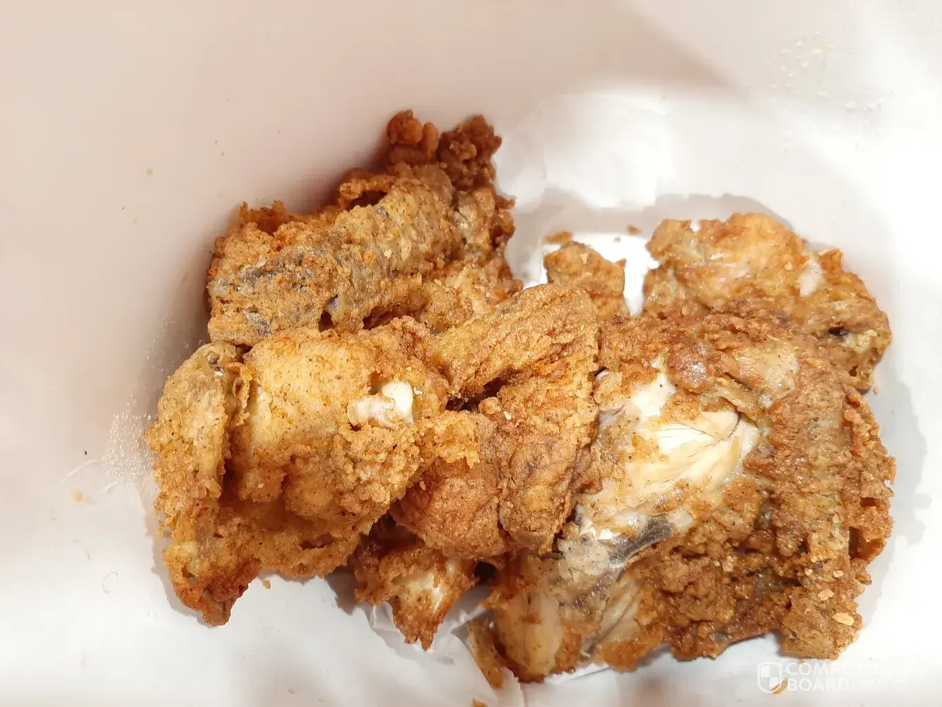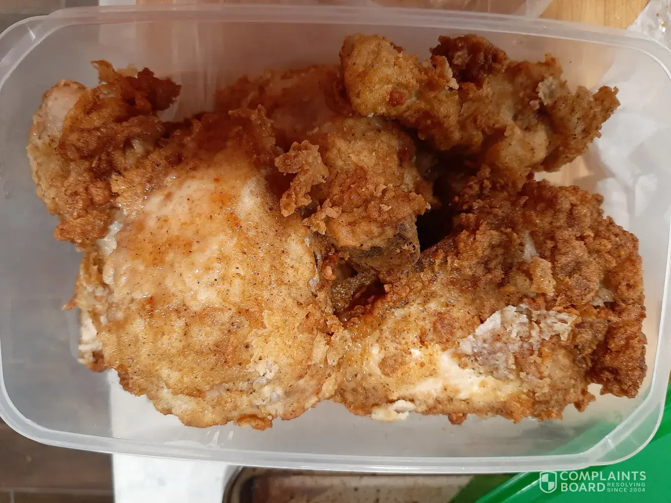 3. As you will see in the attached pictures the chicken crust if you can call it that was SAD! to say the best about it. most of the chicken was missing the crust and looked like they had given us the drags left on the counter no one else would want because our order was a pickup and they could hide its appearance under all the other things they stuff in the SINGLE bucket on top of the chicken.