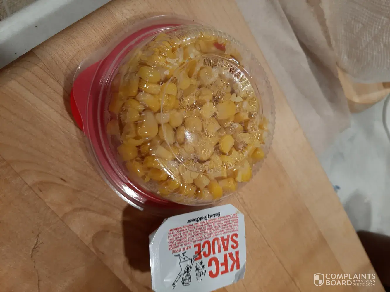 1. The first issue was we ordered (2) two buckets of chicken, but our ENTIRE order was stuffed into (1) one bucket. Which means everything to include the (2) Two full bucket orders of chicken and corn, forks, napkins, and sauces were all in one bucket.