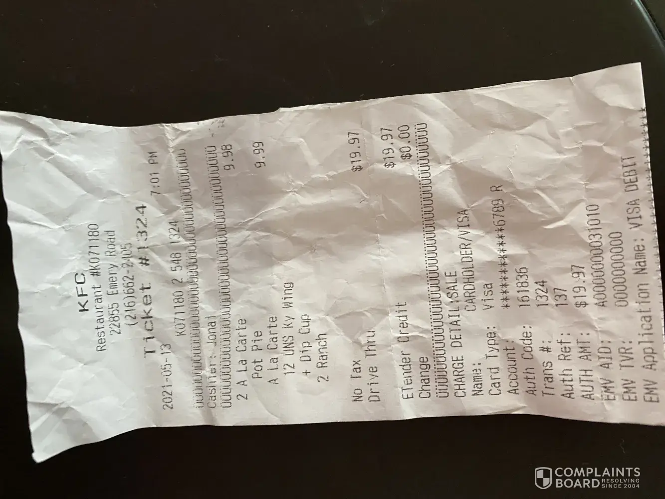 I went to KFC Restaurant #K071180 - and ordered 2 pot pies and 12 hot wings with ranch (no ranch) on [protected] @7:01pm. Drive through only service, it was late and this was supposed to be dinner. I ended up throwing the food out, the pies were over cooked and dried out, the chicken was extremely hard and distasteful. This is not my first rodeo with this location, will be my last time visiting. Thank you!