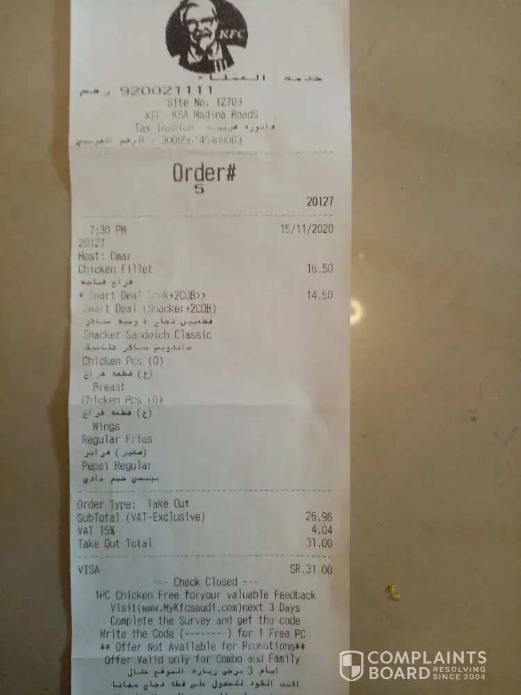 This is my second visit to this branch. I usually buy at the KFC on Prince Sultan Road and have always got finger licking good chicken.