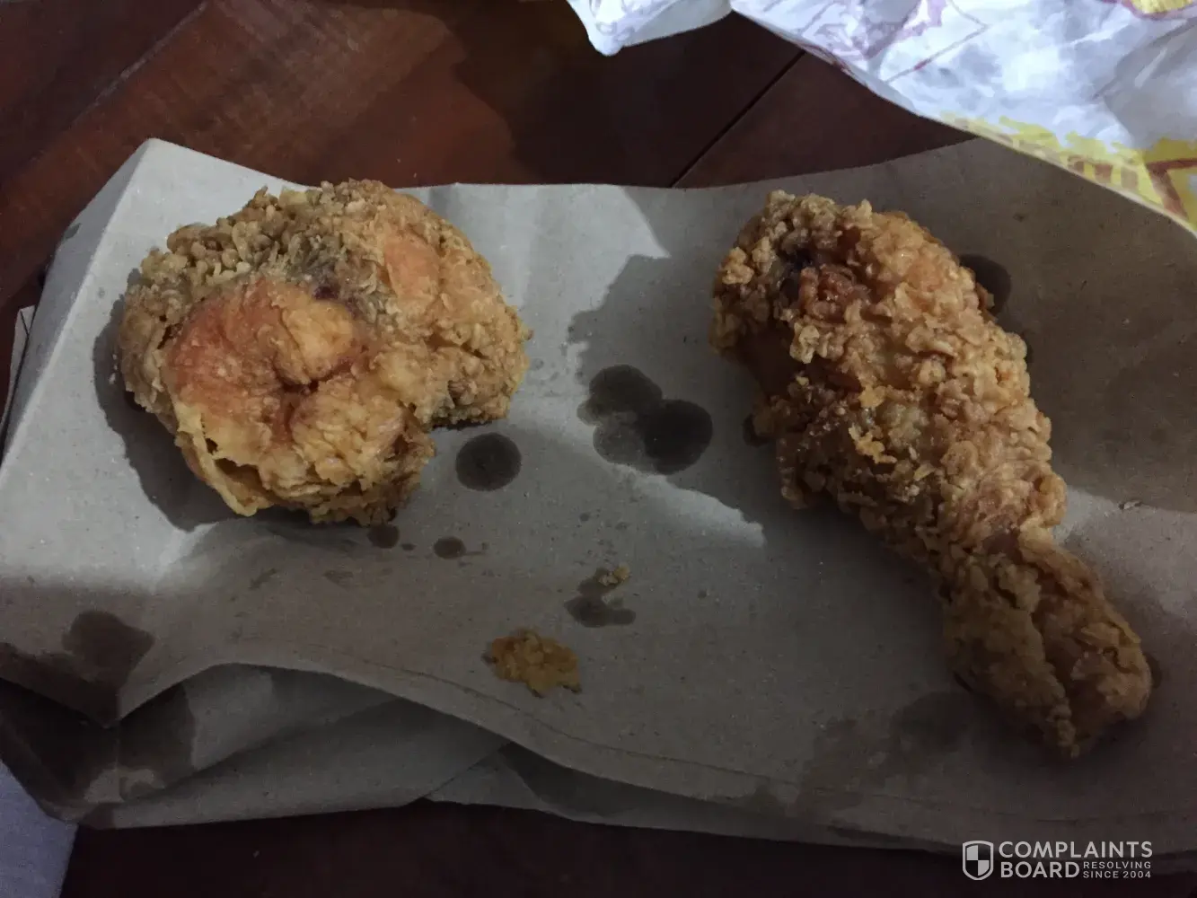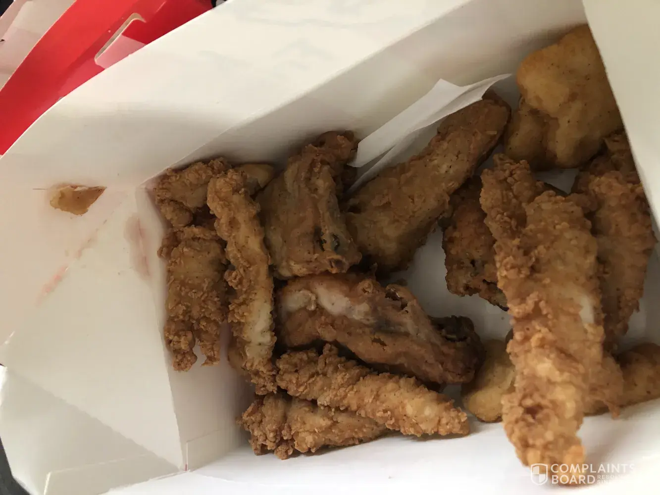 the ordered came on time! in the box I found HALF BREAST (cold and tuff), and the drum stick also cold and smells like living chicken, and the third piece was a cold wing, the three hot wings were not hot, the only warm thing I got was the PEPSI..