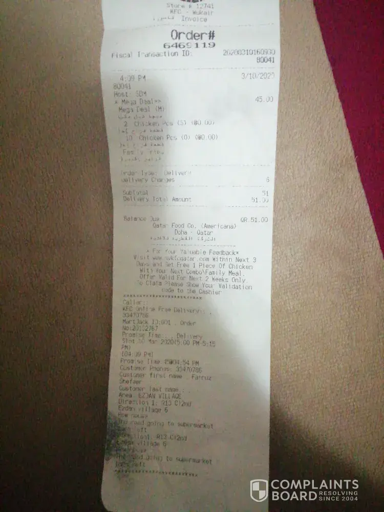 The mega deal offer 12 piece chicken and medium fries.. costing 45 qar. My order number is 6469119. What I found was that the chicken was all hard and dry. Its not seeming fresh. I think it is old stock. I had to throw it coz I just cudnt chew the chicken properly as it was very dry and stale. Only one or two pieces seemed fresh. I think the more offers ur giving the more the customers are getting cheated. I hope this won't be repeated next time. We lost our money buying this and hope we won't lose our health too...! 😓