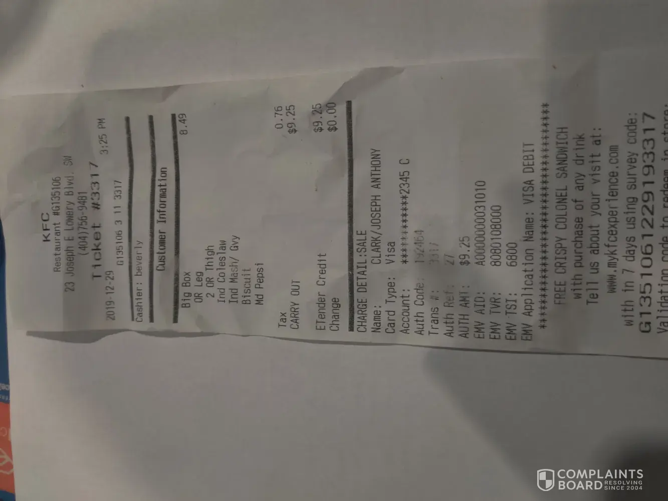 I got my KFC ticket number # 3317 at 3:25 p.m. on 12 /29 /2019 I ordered a number six big box with three pieces with coleslaw and mashed potatoes and gravy cost with tax $9.25 I got chicken that was overcooked and dry. I received a leg, a thigh and a breast when I should have received two thighs and a leg my sides were mashed potatoes and gravy and coleslaw the mashed potatoes had no gravy I called the store to file a complaint I was told that the number 6 big box only came with two pieces of chicken and not three so they would not be able to exchange my order but offered me some new sides I told him I was filing a complaint and they hung up the phone my name is Joseph Clark I am a loyal KFC customer and was disappointed in how the situation was handled I would like a refund or replacement meal [protected] email [protected]@gmail.com