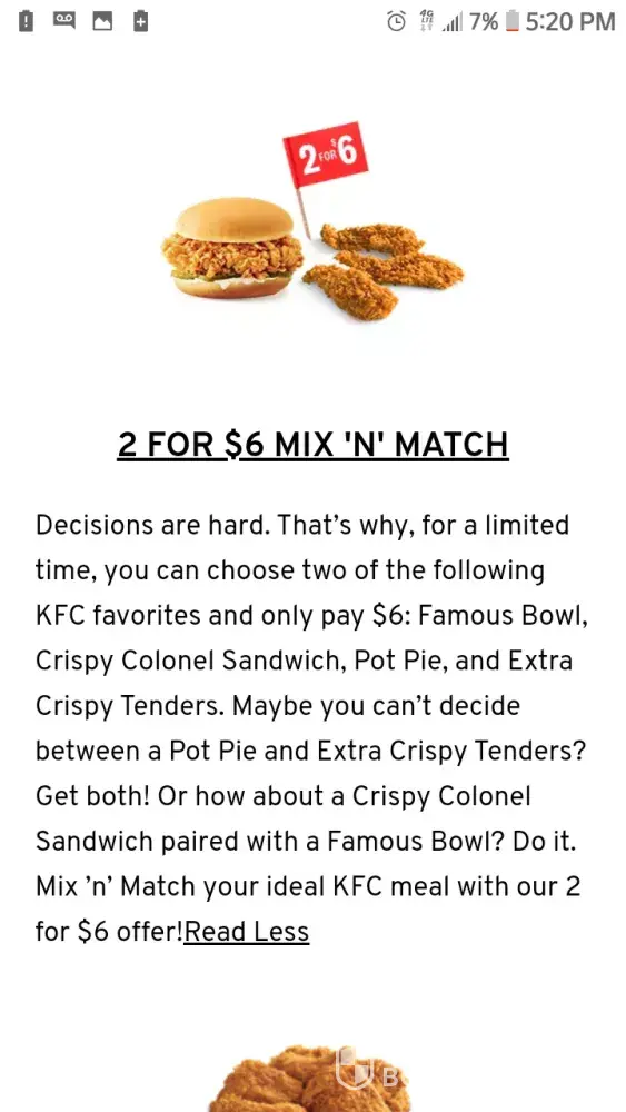 11/1919 4:30 PM So i go to order at my local kfc Go to cashier and ask for the mix and match 2 for $6.00 There were several options either chicken sandwich chicken pot pie Famous Bowl and several other items I was going to order four of the chicken pot pie and four of the famous bowls that would have completed my order but the young man cash register said...