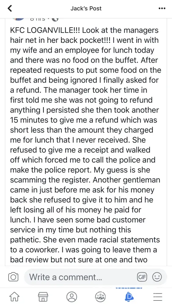 None the less, I left KFC and went to Jack and the Box, worked out well. I'll go straight there next time unless you can tell me why I should return to KFC.