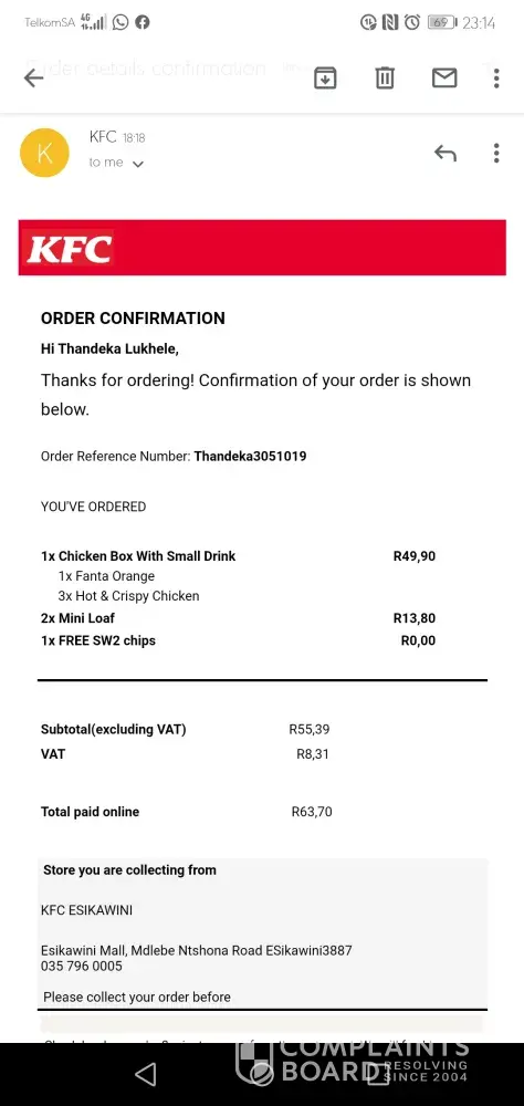 At the Esikhawini branch for collection I was told to check in so my order could reflect, after doing that I got a notification that the order number is invalid or the order has been collected. The cashier told me that I should pay cash again as the will be reversed, so I did so. To my surprise when opening the order it was just a normal streetwise 3 and two mini loafs and was not given as per order online.