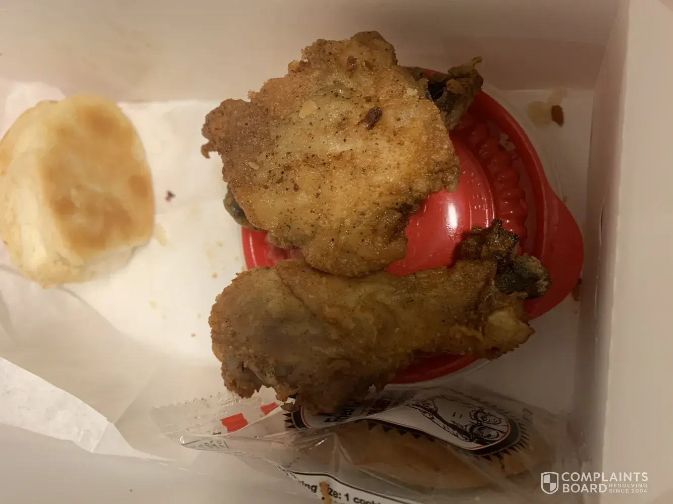 My husband ordered 2 $5 boxes with the 2 Pc chicken with coleslaw as the side. When he got home he had mashed potatoes and that's not the worst part. The worst part was that the chicken was so small that both pieces fit on top of the small side item container. Those had to be cornish hen pieces. I'm so disappointed! With chicken like that those boxes should be $2.50.