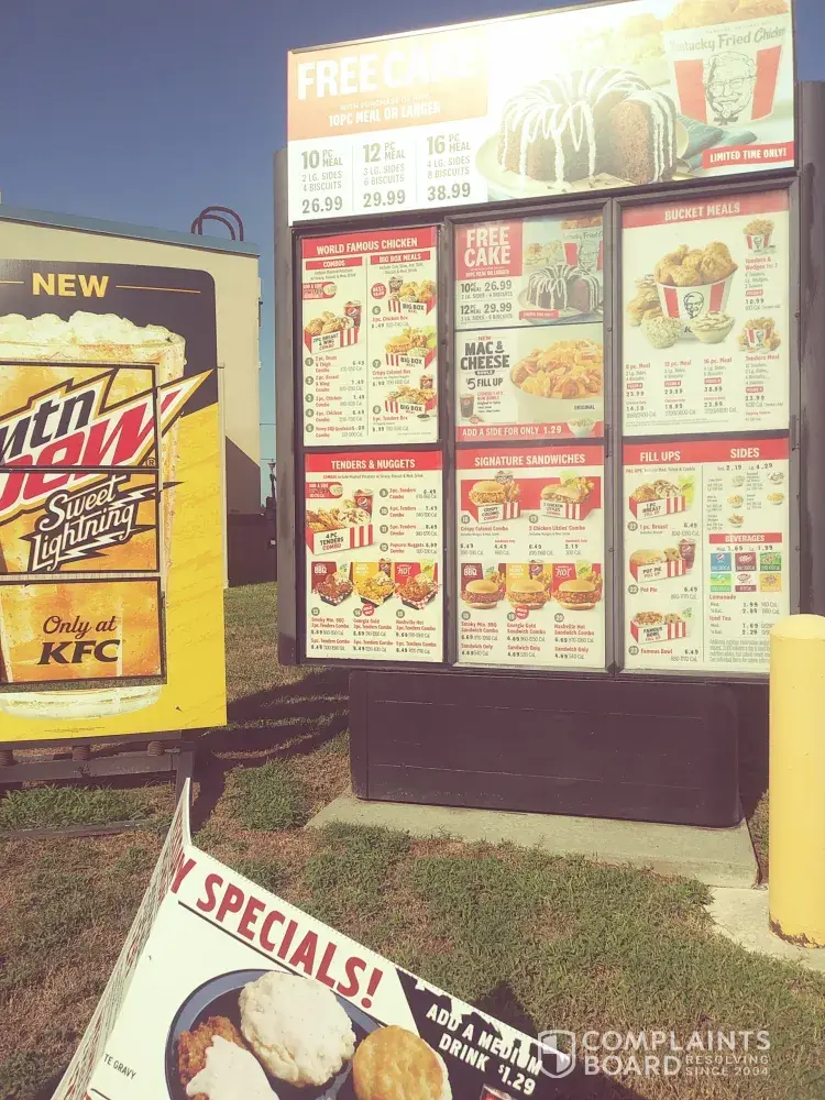 I stopped at a KFC in Chickasha, Oklahoma and ordered a 8 piece meal with Cole Slaw and Mac and Cheese as sides. When I got it to where I was staying, I found the sides I got were Mashed Potatoes and Gravy and Cole Slaw (I guess one out two isn't bad), the biscuits were so dry they fell apart and you were definitely not able to spread anything on them. Then there is the chicken, I ordered original, what I got I am not sure, kind of in between original and crispy, but it was so dry it was not edible. I ended up throwing it in the trash . I will not go to another KFC again.