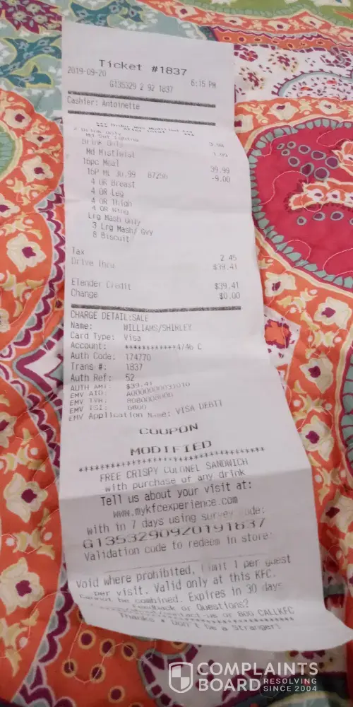 I was at this location on 09/20/19. I had a coupon for the 16 piece meal for $30.99. The coupon was for 16 pieces of chicken, 4 large sides, and 8 biscuits. I got the order got all the way home to have to go back. Because my 4 large sides were missing from the order. When I returned to the restaurant I asked to speak to a manager. She came to the window and...