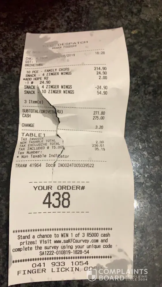 It takes me an hour to drive to the mall and back home and my airtime I wasted cost money, upon my arrival I spoke to Zola and she said she needs to call the supervisor Andrea. Andrea the supervisor only wanted compensate me a street wise 3 and replace my 10 zinger wings. I was unhappy 😒 because my drive time and my my meal was unpleasant and it's not the bloody 1st time, to me as I work in retail that tells me she does not care about the employees who work there cause that means customers can go to hell. KFC is based on satisfactory and happiness on enjoying your meal. But she does not give a [censored] about customers. I requested my full meal to be replaced after all I have been through seeing I have kept quiet the 1st time about my satisfactory and she said no 🚯. So now I report this matter to the health department and to the newspaper 🗞, cause I have had it now. I tried to be nice and drove all the way to KFC and I also I have the previous emails of the burger se attached pics and pics now of my incident