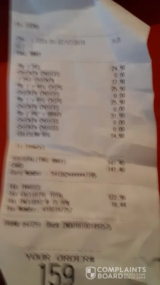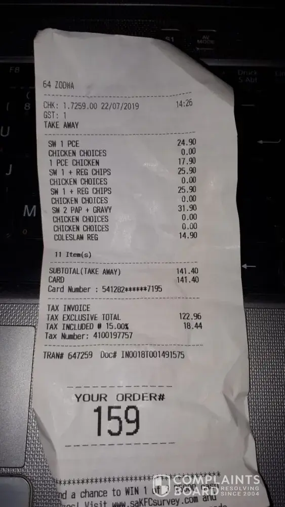 This is over the tenth time I have had an incorrect order from this branch. Today I ordered three streetwise ones. One with mash and gravy. Chicken selection 3 with side breasts. Extra portions 2 thighs and 1 wing. Problem 2 of the orders came without bread rolls. 2 came with center breasts 1 with a thigh. There were no extra pieces although they wete paid fot. The order number is 159. I have reoprted these incidents to kfc customer care on several occasions but nothing has improved. I either want a refund or my correct order!