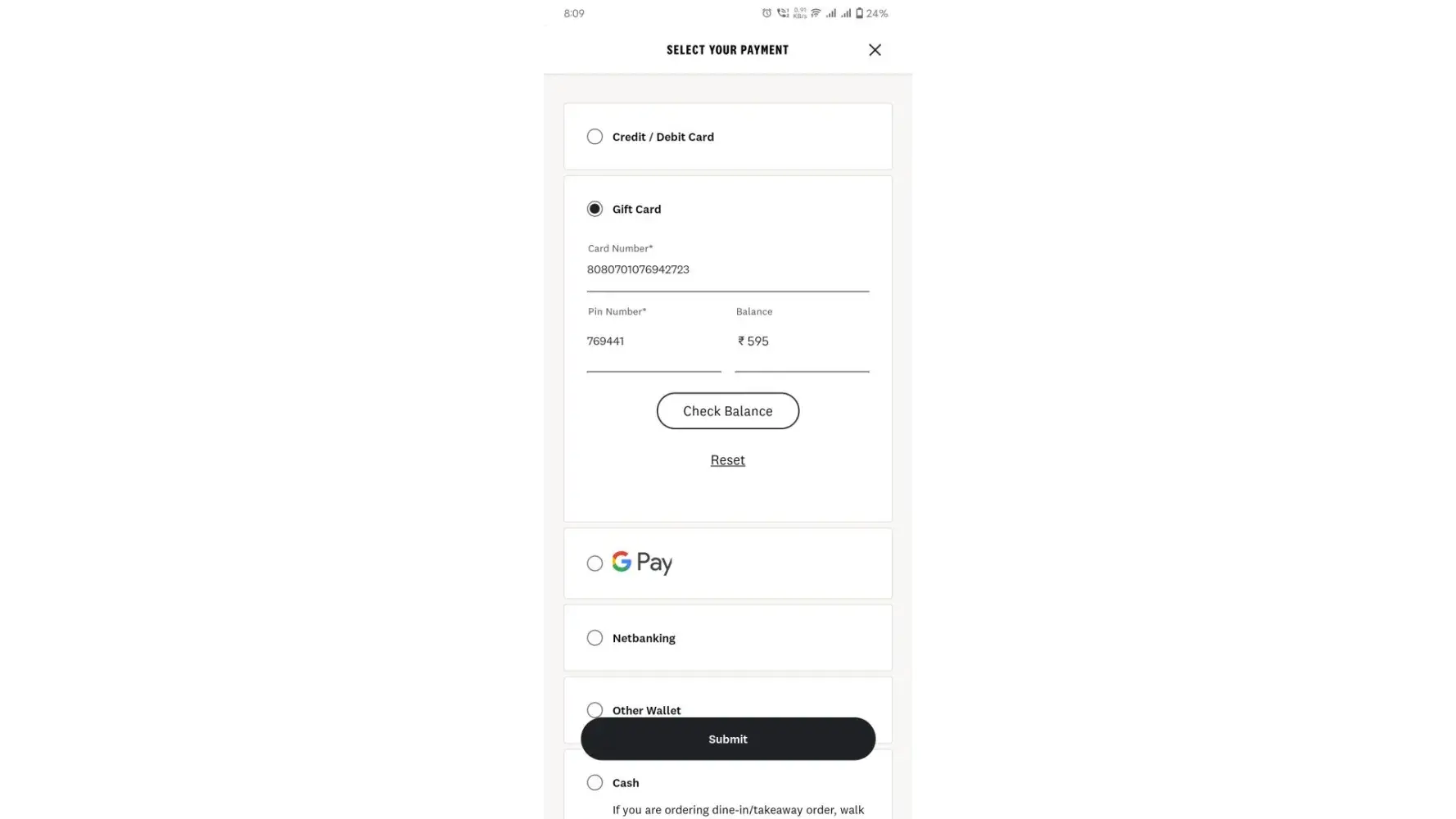 unable to order on KFC application with my gift card amount