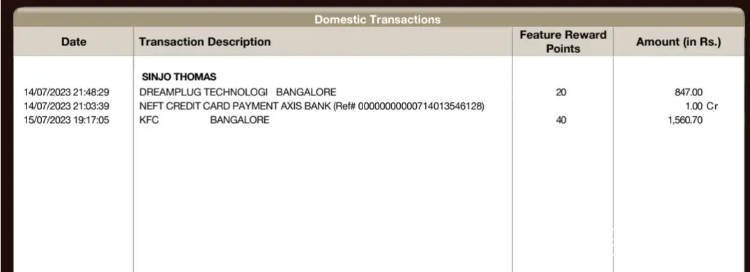 Please note that I made a transaction at KFC restaurant Bangalore at Phenix Mall on 15.07.23 for an amount of Rs 1560.70