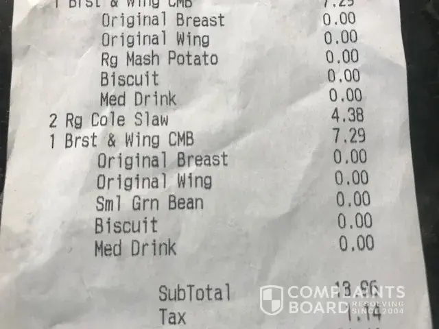 I asked the person that had taken my order why the differences in prices, he said that they had not changed the sign yet. This is false advertising! I asked for the manager, told her that the price on the board for the K2 was $6.99 and I had been charged $7.29. She said that I had been charged $7.29 because I ordered white meant (breast & wing) I told her that this was not true. The menu board said specifically $6.99 for a breast & wing combo (see photos). The same thing happened with the extra sides. She refunded me the difference for each and did not want to give me the tax that I had paid for each. She finally gave me the tax that I had paid on the $1.00 that they had over charged me.