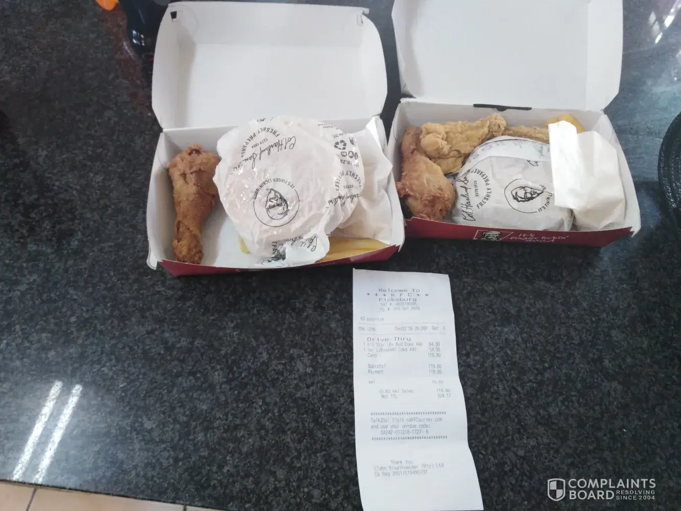 We decided to go back to KFC Protea Heights, as their drive through was working, it was just the soda machine that was out of order. We waited for an HOUR in the drive through before we got our food. Not because they were busy, but because everything was so slow. I mean, a drive through is supposed to be fast but the people inside of the restaurant got their food before the people in the drive through. We ordered two fully loaded box meals, and the Colonel burger was more bread than anything else.