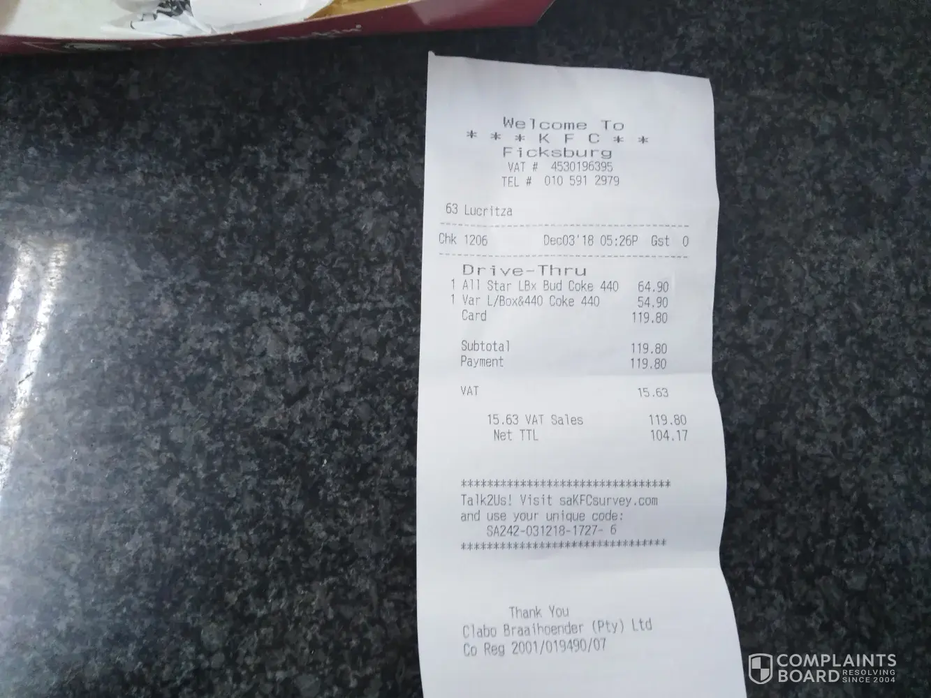 We went to Kfc Ficksburg to buy a nice meal we gave our order after looking at the board and seeing the All Star LBx Bud and the Var L/box. First off they told us there coke machine is not working and that they going to give us 440ml cold drink bottles, and the sales lady told us they going to charge us extra for these cold drinks, I asked her and don't understand why we have to pay extra. She just said sorry so I excepted her appoligie. The order was very fast amazingly fast. When we got home and I opened the boxes I was so disappointed it was not what we expected. My bun was stale and crumbled while eating it. The product inside the box was not at all what I saw on the advertised board. I do not complain but this was suppose to be a treat for me and my husband, I work for my income and I expect what I see and is willing to pay for a proper meal. Regards Lorraine Olivier