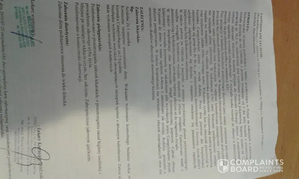 3 days after on thursday 19th july late evening, both of them was admitted to zeromski hospital in krakow with high fever and abdomen pain. Several tests were taken and the results was that they had campylobacter jejuni... Food poison caused from chicken. My eldest daughter was weaker the her sister because she had ate all her 3 pcs of chicken and she needed to be operated as well cause the bacteria has inflammated her appendix :- (we lost our flight on saturday 21st as the girls were till in hospital for treatment and very weak. My husband and I ended up sleeping at hospital with the luggages as were were then without accomodation (homeless) as our apartment was booked till saturday 21st. The girls were out of hospital on wednesday 25th july afternoon and fortunately we found a hotel until our flight back to malta. It wasn't east to find an acomodation and a flight back as it was peak season. I have all the documents from hospital and even the sanity report. Your chicken has riuned our 1st family holiday as it was my daughters first time abroad and they were really looking forward. We ended up staying 2weeks in krakow instead of 1week and most of it we were in hospital or recovering in the hotel. We flew back to malta last saturday 28th july and the girls are still weak to ejoy their summer holidays or even swim this summer. My eldest daughter will have a big mark on her tummy for the rest of her life. I would like a compensation for all this cause it's not fair. Kfc should be responsible for his food espacially when it comes from chicken.in krakow there are so many kfc's and I really hope no other patients were sick like my daughters. It's really scary cause it could have been fatal! You should take your responsability regarding this issue. I'm sorry to say but I would never trust your chicken again... It was a real nightmare have 2 kids dead sick in 2 different wards and far away from you home country. Attached you will find some photos of the hospital documents that show that both girls had camplobacter after eating kfc chicken. Wiating for your reply.