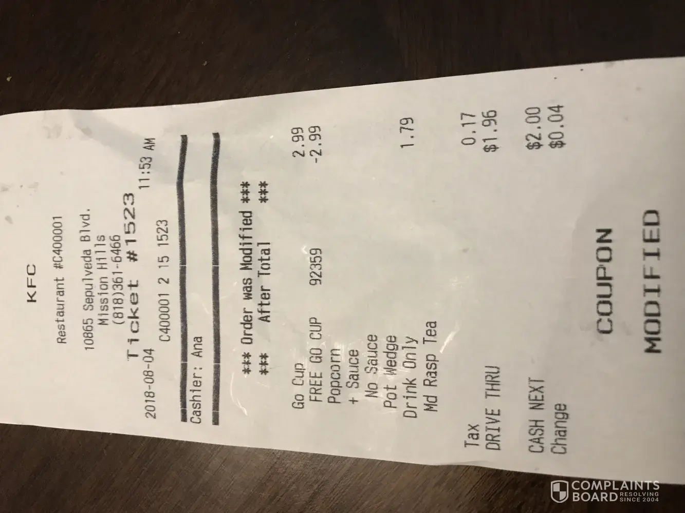 I visited the KFC nest my home today. From my last visit there was was a survey I completed for a to go cup just purchasing any size drink. That is exactly what I did and the cashier by the name of Ana was the rudest person ever. She snatched my receipt with the code and I order a small drink and charge me for a medium. I paid her a she attempted to hand me my cup uncovered and not bagged. Through this she continued to mumble to another person making comments in Spanish. I asked for sauce and she was bothered then I ask for a bbq for the popcorn chicken again mumbled and closed her drive thru window. The saddest thing is that the other person that was Giggling I believe was a sup or manager due to her shirt being blue not like the cashier. This is why I would not complain to the store directly. Customers make establishments by frequenting them. No customers = no money if I am correct. Although KFC. Has been around since I can remember service like this tarnished the reputation in my opinion. The code I submitted for my cup was 21089 her info is on my receipt reads her name today's date and time of 11:53 am. Restaurant is C00001 ticket 1523 in Mission hills, ca. I will not be returning to your establishment after my experience.