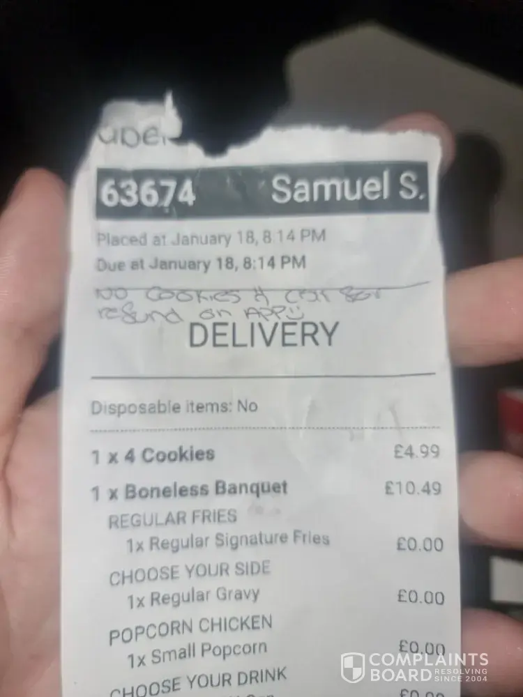 Larne kfc never sent my cookies with my order, told me to ask uber for a refund which they are refusing to refund. People just can't steal money and not provide a service or rectify the issue. I feel robbed
