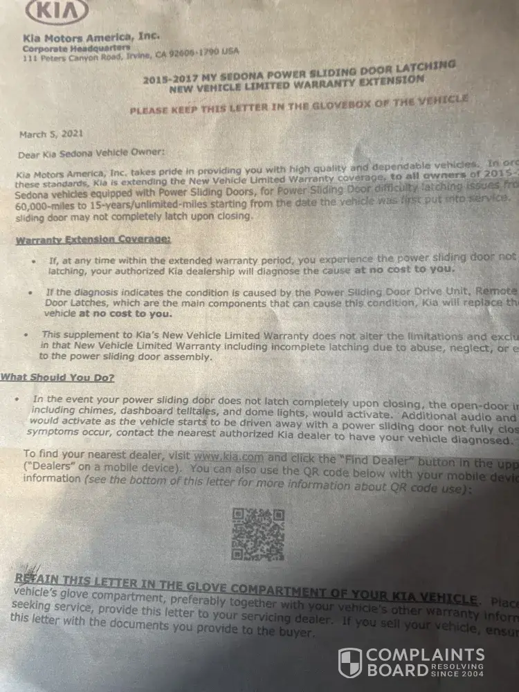 I received a letter from Kia for my 2014 Sedona I did not look at the top which that the recall was for the 2015 to 2017 however my 2014 model also has a recall on the same sliding door issue just a little bit less coverage for the 2014 then the 2015 through 2017 models. When I had my car towed on October 19, 2021 to the Kia dealership in Schenectady...