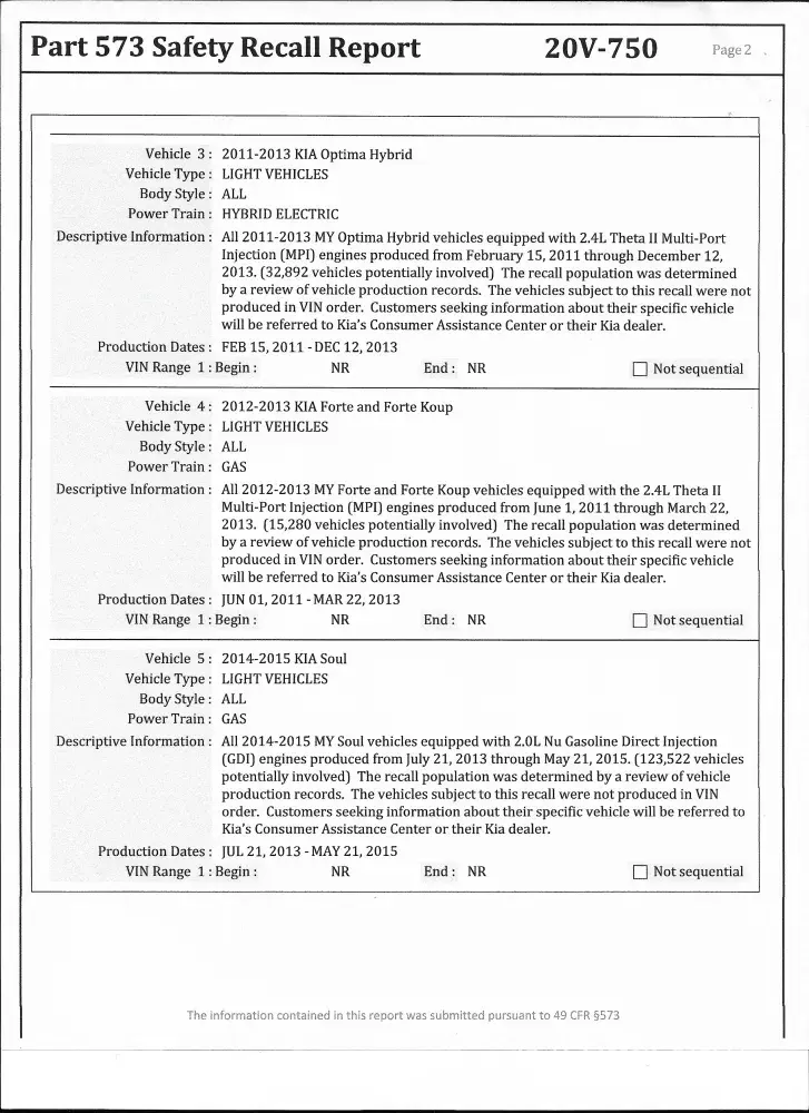 At about 90k miles, my daughters newly-acquired Kia Forte started making a grinding sound when accelerating. Mechanic and dealership have diagnosed the problem as an engine issue that requires a completely new engine--cost over $5K. Mechanic noted that the engine in my Kia is the same engine recalled in the NHTSA Recall No. 20V-750, manufacturer recall SC200. If Kia covered an engine replacement for those models with the same engine, should not this engine also be covered by KIA?
