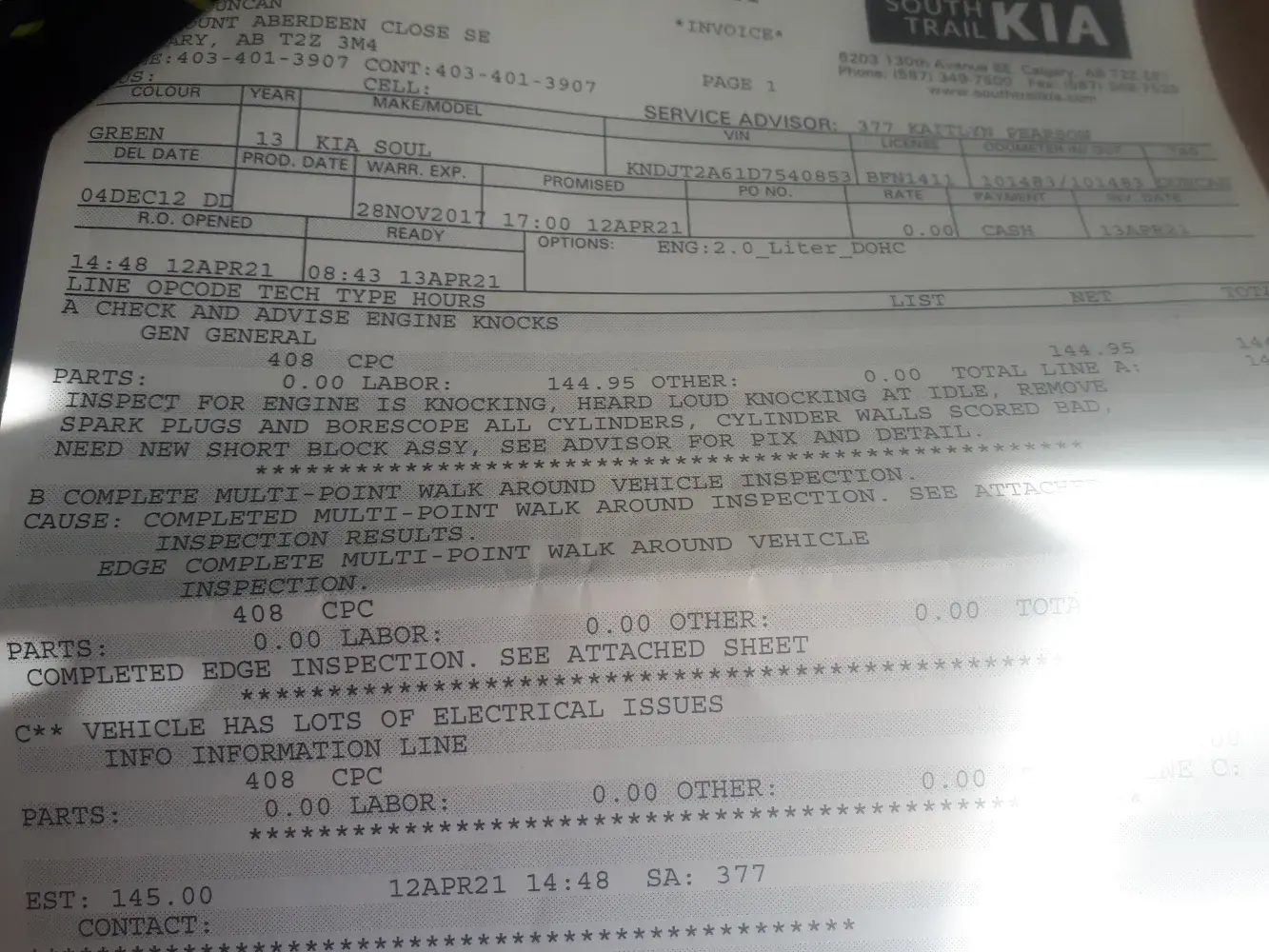 Despite doing regular oil changes my 2013 Kia Soul needs a new engine at only 101, 404 K on the engine! At a Kia dealer, I was first accused of not doing oil changes - until I produced all the receipts. then I was shown no sympathy from them and told the cost to replace the engine would be $6000! For a very well-maintained engine to die at 100k is a disgrace and I will never purchase a Kia product again. I feel cheated, ripped off, and plain repulsed at how junky my Kia is---besides the engine - here goes: