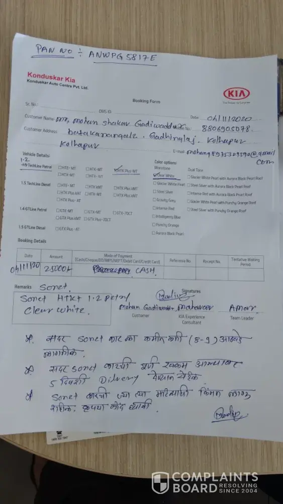 I am booking kia sonet htk plus in 5th November 2020.That time they will told me l got my car in 8 or 9 weeks.After that time l oftenly ask them about my car .They will told me we are give your car january end or February first week but when l ask them in February they will told me march end or in April.I want explanations about this my complaint