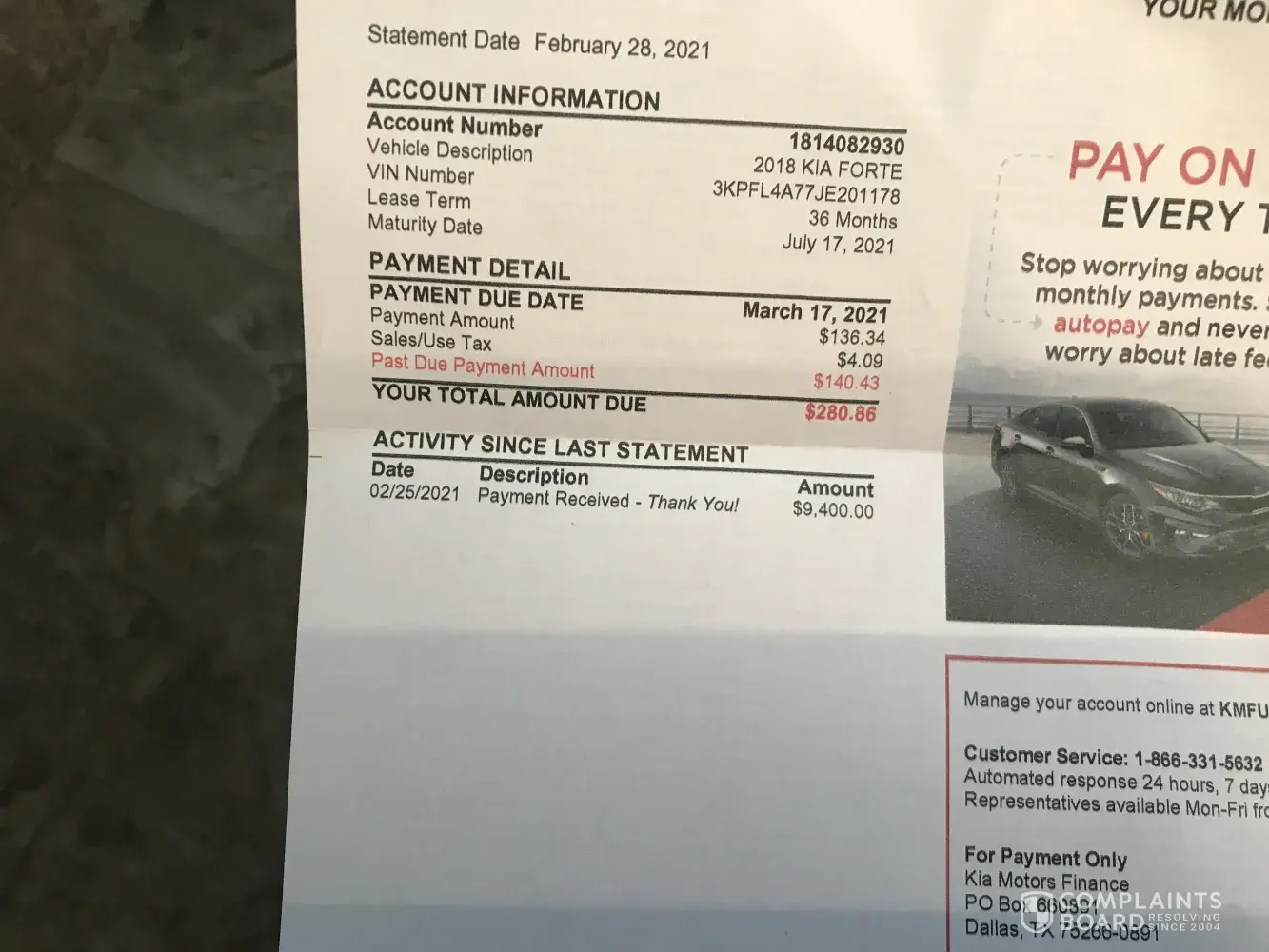 I writing you this letter because the Finance Department keeps calling me to collect money that I have paid them, I just received a bill for .66 cents, dated 01/21/2021 in which I paid. I do not owe Kia any money, I have all the documents and payments sent to Kia.