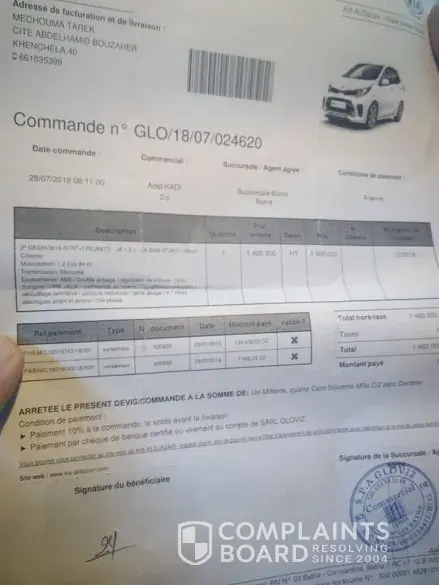 I did a command at the sarl gloviz algerian kia distributor and I was mentioned in the po that the delivery will be within 45 days, however I waited until the end of december and I paid total amount in december based on their engagement to deliver me the car in three days, it was not the case unfortunatelly each time I call them they give me stupid execuses which I believed at the begining but I realized that they were neglecting and ignoring me in the meantime I realized that my car has been given to another client however my request is an old one and they changed my serial number of my car in the system as to be delivered in another four months