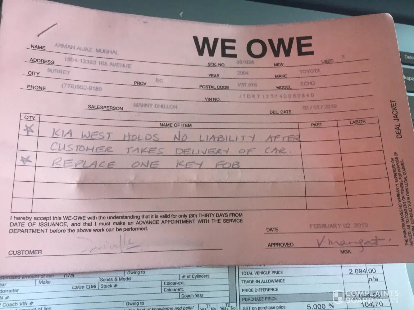 I was looking for a used small vehicle of any brand. I found Nissan Sentra on Kia West website and contacted them and one of the salesman at Kia Service contacted me and convinced me to visit their dealership at coquitlam. Before I reached dealership, Saleman told me that Nissan Versa is not available and he still convinced me to visit their dealership as there are other preowned vehicles I may be interested in. I went there and Salesman named Mangat showed me "2008 Toyota Echo hatchback", we agreed on price and he was due to get the safety inspection done. It was agreed that I will visit in next 1-2 weeks once vehicle is ready to pick up. I paid $500 advance too. It was dark, and car was full of dust and we were not offered for a test drive. Instead, I noticed that salesman was more interested to discuss and convince me buying new brand kia sorento and he took me to a test drive too of Kia sorento but Kia Echo wasn't in a position for test drive.
