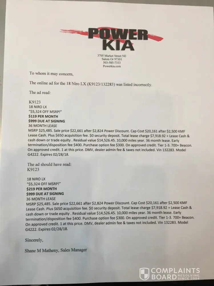 Second, your complaint stems from an ad you found on the "powerkia.com" website. This website is in no way owned or run by Kia. Power Kia is a dealership in Oregon. Power Kia is not owned or ran by Kia. The only reason Kia is brought into this discussion is because Kia brand merchandise is the form of cars the Power Kia dealership promotes and sells.