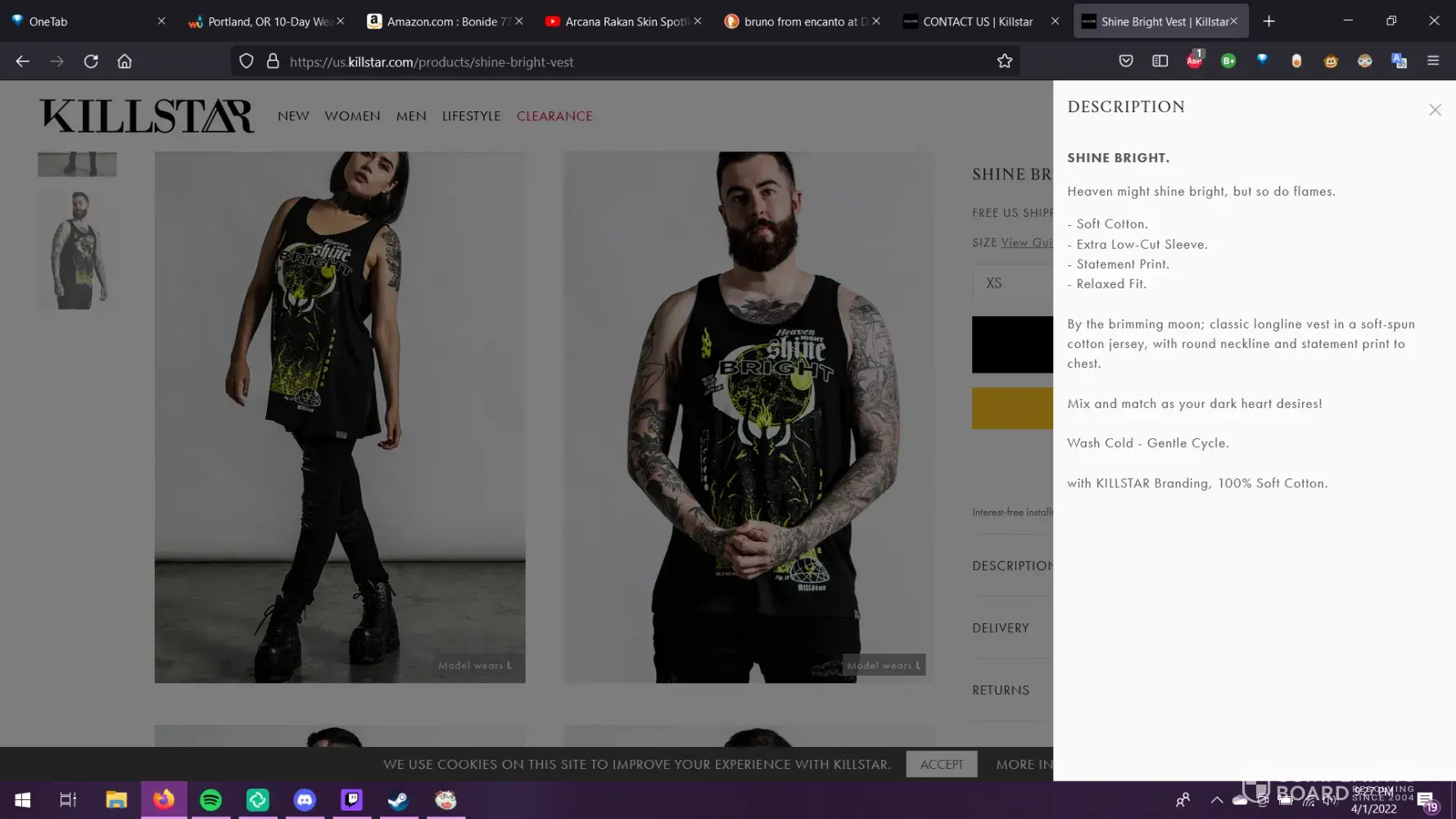 Killstar advertised on their website and on my invoice that the vest/tank top was 100% cotton. It said it on the invoice which is bonkers. The shirt didn't feel right to the touch, because cotton has a specific feel, the tag said it is 60% polyester, 35% rayon, and 5% elastane. There's not an iota of cotton in it! 0% cotton for a shirt that is advertised as 100% cotton. False advertising. There's no fine print that says it can be variable or synthetic. Just completely false. I'm so shocked.